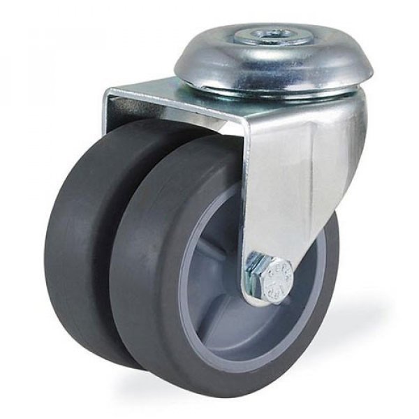 Поворотные сдвоенные колесные опоры, крепление — отверстие под один центральный болт. Полипропиленовый обод колеса с шинкой из темно серой резины, твердость 85±3° Shore A, не оставляет следов на полу. Рабочая температура от -20°С до +50°С. Производство завода «KAMA» (Турция)