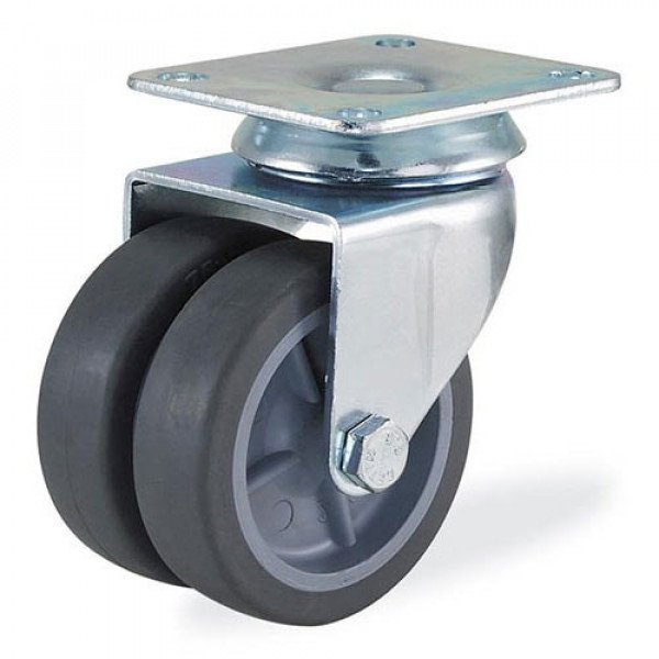 Поворотные сдвоенные колесные опоры, крепление — с крепежной площадкой под четыре болта. Полипропиленовый обод колеса с шинкой из темно серой резины, твердость 85±3° Shore A, не оставляет следов на полу. Рабочая температура от -20°С до +50°С. Производство завода «KAMA» (Турция)