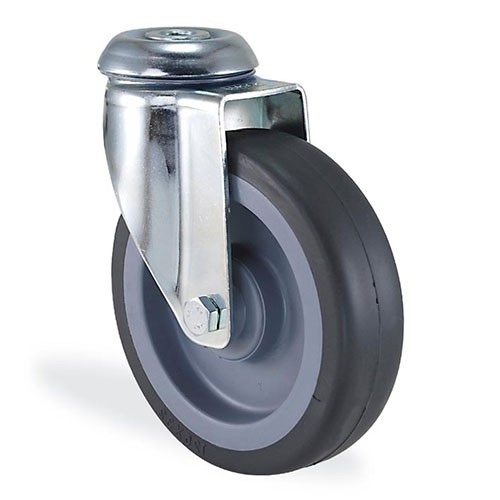 Колесные опоры с креплением под один центральный болт. Обод колеса из высококачественного полипропилена светло серого цвета, контактный слой — термопластичная серая резина, твердость 85±3° Shore A, не оставляет следов на полу. Поворотный узел с двухрядным шарикоподшипником, в оси колеса втулка скольжения или шариковый подшипник. Металлическая педаль тормоза фиксирует поворот колеса и поворотный узел. Рабочая температура от -20°С до +50°С.