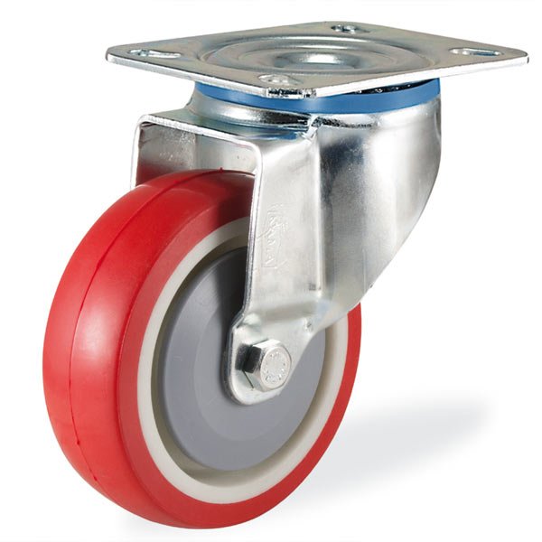 Колеса бережно относятся к поверхности пола, не оставляют следов при этом очень устойчивы к истиранию и воздействию многих агрессивных веществ. В оси колеса прецизионный шарикоподшипник закрытый пластиковыми крышками . В поворотном узле кронштейна двухрядный шарикоподшипник.