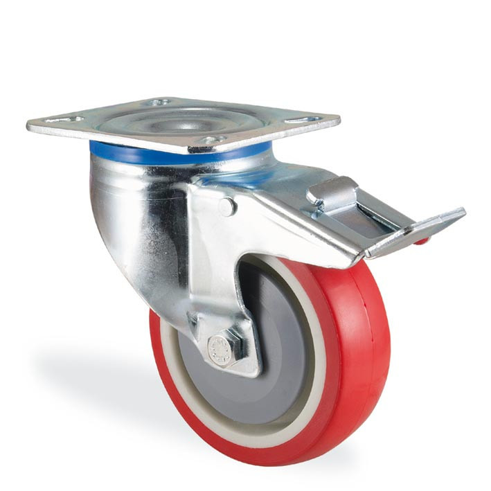 Колеса бережно относятся к поверхности пола, не оставляют следов при этом очень устойчивы к истиранию и воздействию многих агрессивных веществ. В оси колеса прецизионный шарикоподшипник закрытый пластиковыми крышками . В поворотном узле кронштейна двухрядный шарикоподшипник.