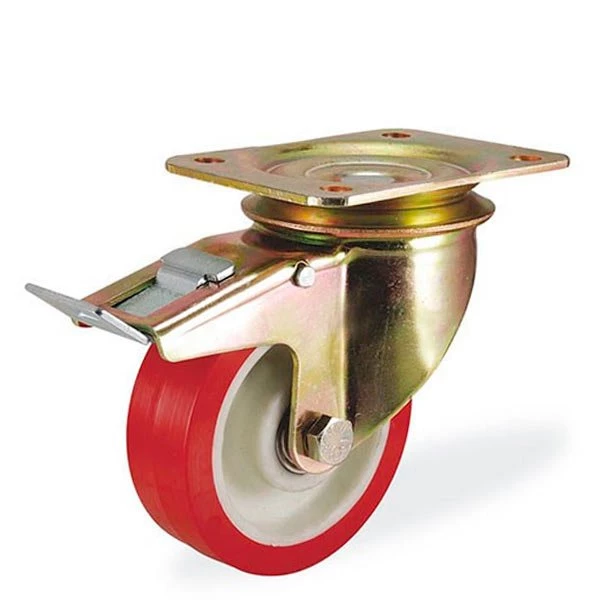 Колесо отлито из большегрузного полиамида, контактный слой — полиуретан красного цвета, твердость 95˚±2 Shore A. Профиль шинки плоский. Колеса бережно относятся к поверхности пола, не оставляют следов при этом очень устойчивы к истиранию и воздействию многих агрессивных веществ. В оси два прецизионных шарикоподшипника с распорной втулкой. В поворотном узле кронштейна двухрядный шарикоподшипник. Рабочая температура от -20˚С до +70˚С. Производство завода «КАМА» (Турция).