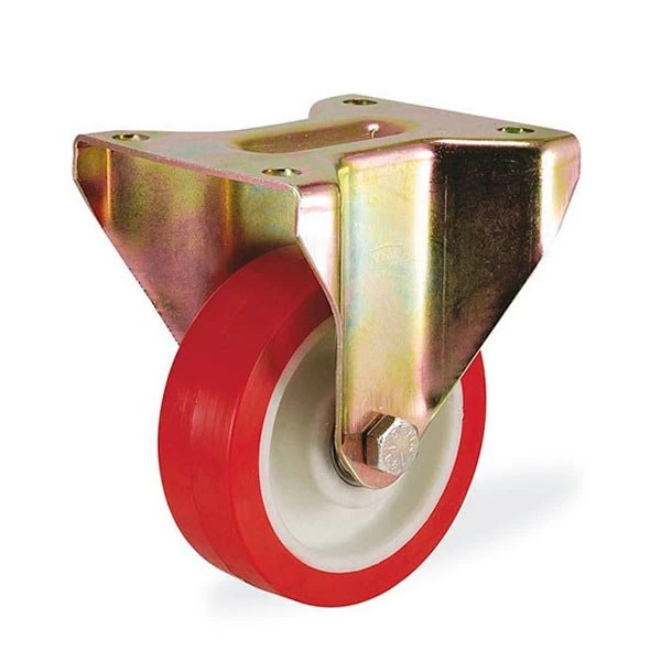 Колесо отлито из большегрузного полиамида, контактный слой — полиуретан красного цвета, твердость 95˚±2 Shore A. Профиль шинки плоский. Колеса бережно относятся к поверхности пола, не оставляют следов при этом очень устойчивы к истиранию и воздействию многих агрессивных веществ. В оси два прецизионных шарикоподшипника с распорной втулкой. В поворотном узле кронштейна двухрядный шарикоподшипник. Рабочая температура от -20˚С до +70˚С. Производство завода «КАМА» (Турция).