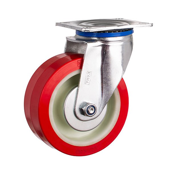 Колесо отлито из полиамида, контактный слой — полиуретан красного цвета, твердость 95˚±2 Shore A. Профиль шинки плоский.