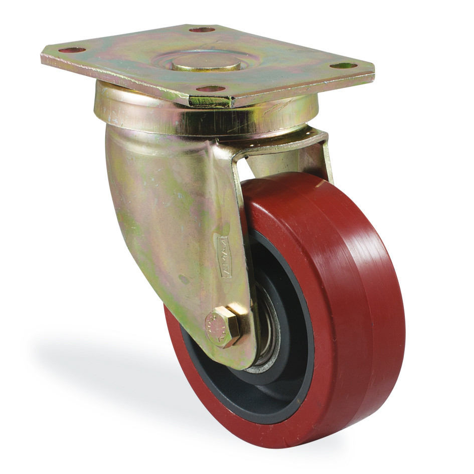 Основание колеса изготовлено методом литья под давлением из большегрузного полиамида темно серого цвета со специальными добавками (Kamalon), контактный слой — бордовый полиуретан твердостью 92˚±2 Shore A,неразъёмно соединенный с основанием посредством химической связи. Колеса бережно относятся к поверхности пола, не оставляют следов, очень устойчивы к истиранию. Рабочая температура от -30˚С до +70˚С.