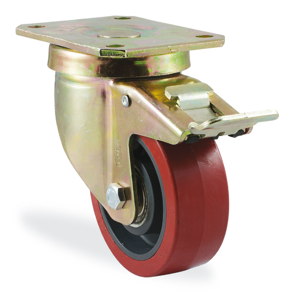 Основание колеса изготовлено методом литья под давлением из большегрузного полиамида темно серого цвета со специальными добавками (Kamalon), контактный слой — бордовый полиуретан твердостью 92˚±2 Shore A,неразъёмно соединенный с основанием посредством химической связи. Колеса бережно относятся к поверхности пола, не оставляют следов, очень устойчивы к истиранию. Рабочая температура от -30˚С до +70˚С.