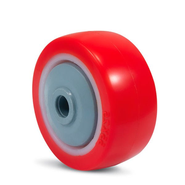 Обод колеса изготовлен из высококачественного полиамида белого цвета, контактный слой из полиуретана красного цвета твердостью 96 Shore A. В оси колеса один шариковый подшипник, закрытый пластиковыми втулками. Колеса этой серии обладают высокой устойчивостью к множеству агрессивных веществ и при нормальных условиях эксплуатации не требуют ухода. Рабочая температура от -30°С до +60°С.