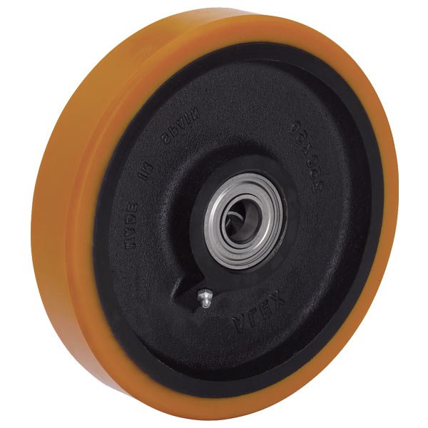 Обод колеса изготовлен из серого чугуна, покрытого слоем защитного лака черного цвета. Контактный слой – полиуретан желто-оранжевого цвета твердостью 95° Shore A. В оси колеса два шариковых подшипника, ступица оснащена смазочным ниппелем. Рабочая температура от -30°С до +70°С. Производство завода Alex (Испания).