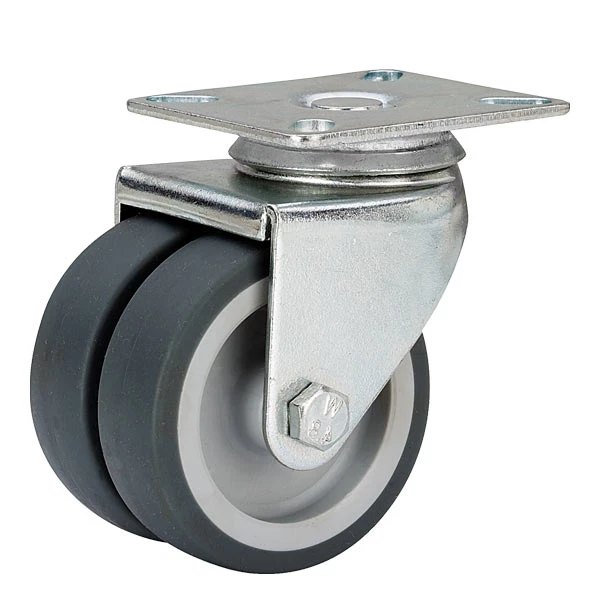 Сдвоенные колесные опоры очень маленького диаметра. Обод колеса отлит из высококачественного полипропилена, шинка — термопластичная светло серая резина. В оси втулка скольжения. Рабочая температура от -20°С до +60°С. Производство завода «ALEX» (Испания).