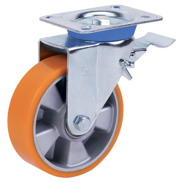 Поворотный узел с двухрядным шарикоподшипником, спрессованным специальным методом, обеспечивающим минимальный люфт и легкое вращение. Обод изготовлен из большегрузного алюминия, покрытого слоем защитного лака. Контактный слой – полиуретан оранжевого цвета твердостью 92° Shore A. В оси колеса два шариковых подшипника. Отличительной особенностью этих колес является устойчивость к сильным ударным нагрузкам, устойчивость к порезам, высокая плавность хода, низкий уровень издаваемых при движении шумов.