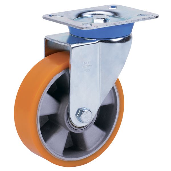 Поворотный узел с двухрядным шарикоподшипником, спрессованным специальным методом, обеспечивающим минимальный люфт и легкое вращение. Обод изготовлен из большегрузного алюминия, покрытого слоем защитного лака. Контактный слой – полиуретан оранжевого цвета твердостью 92° Shore A. В оси колеса два шариковых подшипника. Отличительной особенностью этих колес является устойчивость к сильным ударным нагрузкам, устойчивость к порезам, высокая плавность хода, низкий уровень издаваемых при движении шумов.