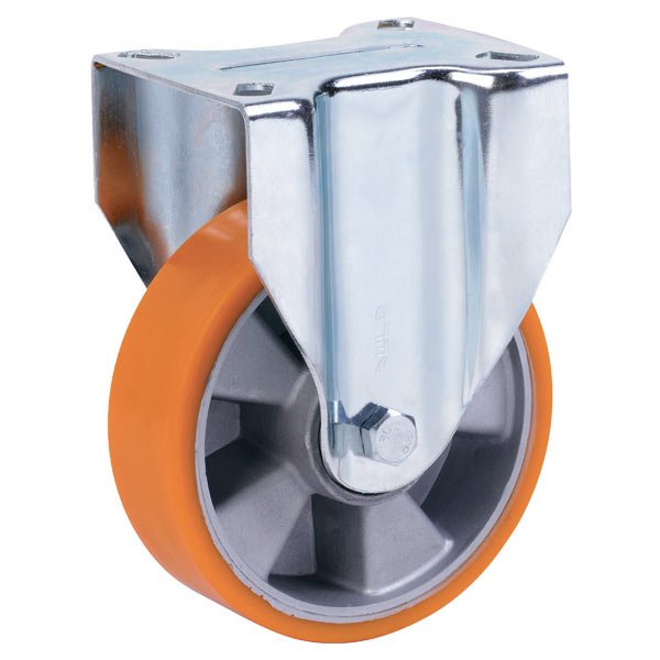 Поворотный узел с двухрядным шарикоподшипником, спрессованным специальным методом, обеспечивающим минимальный люфт и легкое вращение. Обод изготовлен из большегрузного алюминия, покрытого слоем защитного лака. Контактный слой – полиуретан оранжевого цвета твердостью 92° Shore A. В оси колеса два шариковых подшипника. Отличительной особенностью этих колес является устойчивость к сильным ударным нагрузкам, устойчивость к порезам, высокая плавность хода, низкий уровень издаваемых при движении шумов.
