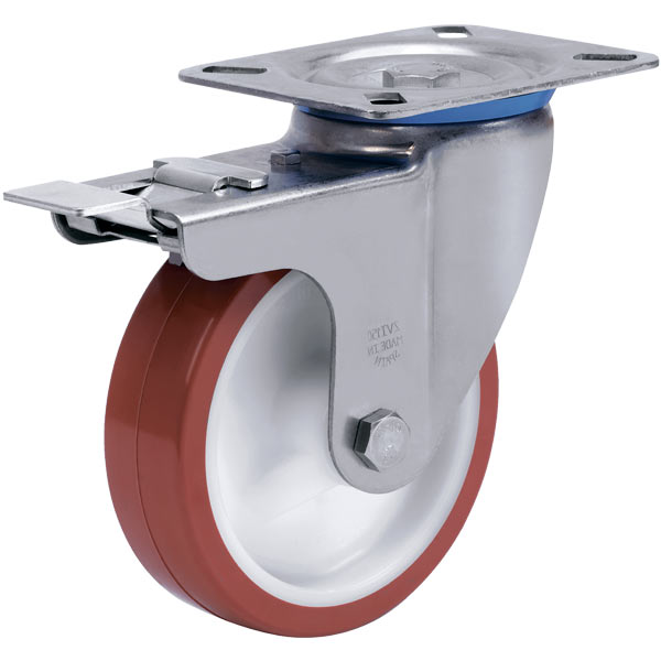 Поворотные колесные опоры из нержавеющей стали, крепление — площадка под четыре болта. Все детали (шарики, осевая втулка, болт и гайка) также изготовлены из нержавеющей стали. Обод колеса изготовлен из высококачественного полипропилена белого цвета, контактный слой из полиуретана коричневого цвета твердостью 92° Shore A. Колеса этой серии устойчивы к истиранию, не оставляют следов и цветовых изменений на контактный поверхностях, при нормальных условиях эксплуатации не требуют ухода. Рабочая температура от -25°С до +80°С. Производство завода ALEX (Испания).