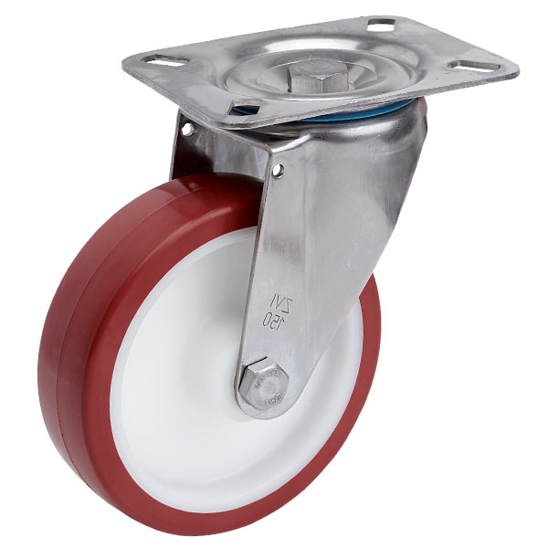 Поворотные колесные опоры из нержавеющей стали, крепление — площадка под четыре болта. Все детали (шарики, осевая втулка, болт и гайка) также изготовлены из нержавеющей стали. Обод колеса изготовлен из высококачественного полипропилена белого цвета, контактный слой из полиуретана коричневого цвета твердостью 92° Shore A. Колеса этой серии устойчивы к истиранию, не оставляют следов и цветовых изменений на контактный поверхностях, при нормальных условиях эксплуатации не требуют ухода. Рабочая температура от -25°С до +80°С. Производство завода ALEX (Испания).