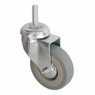 Поворотные колесные опоры, крепление -под один центральный болт. Шинка — серая резина, твердость 70±4º Shore A, не оставляет следов на полу; обод — полипропилен, закрыт с двух сторон стальными колпачками. Поворотный узел с двухрядным шарикоподшипником, в оси колеса втулка скольжения. Рабочая температура от -20°С до +50°С.