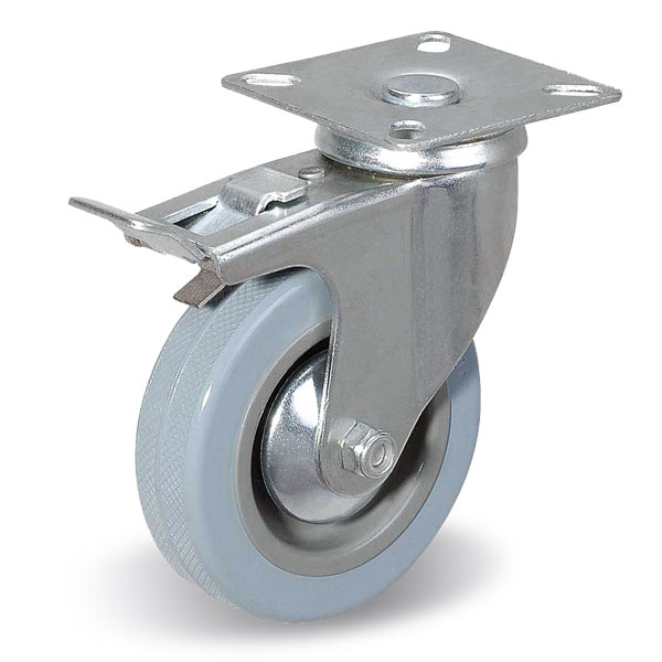 Колесные опоры с крепежной площадкой под четыре болта. Шинка — серая резина, твердость 70±4° Shore A, не оставляет следов на полу; обод — полипропилен, закрыт с двух сторон стальными колпачками. Поворотный узел с двухрядным шарикоподшипником, в оси колеса втулка скольжения. Стальной тормоз фиксирует поворот колеса и поворотный узел. Рабочая температура от -20°С до +50°С.