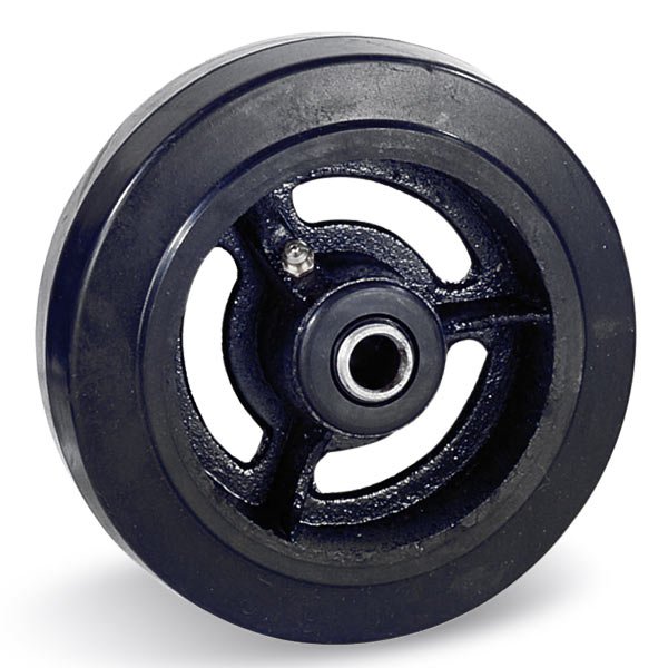 Литой чугунный обод колеса состоит из трех спиц для облегчения всей конструкции, шинка — литая резина черного цвета, в оси колеса роликовый (игольчатый) подшипник. Ступица оснащена ниппелем для смазки подшипника. Рабочая температура от -35°С до +50°С.