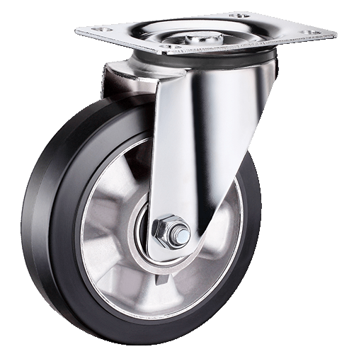 Поворотная большегрузная колесная опора с шинкой из черной резины. Обод отлит из легкого алюминиевого сплава. В ступице установлен двойной шарикоподшипник. Сварной кронштейн изготовлен из оцинкованной листовой стали. Тип крепления — платформа под 4 болта. В поворотном механизме установлен двухрядный шарикоподшипник. Не требовательна к качеству опорной поверхности. Максимальная грузоподъемность данной модели составляет 500 кг.