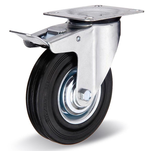 Колесные опоры серии С-SLS с платформенным креплением. Шинка — полуэластичная черная резина, обод из листовой стали с двух сторон закрыт защитными колпачками. В оси колеса роликовый подшипник. Поворотный узел с двухрядным шарикоподшипником. Стальной тормоз фиксирует поворот колеса и поворотный узел. Рабочая температура от -25°С до +50°С