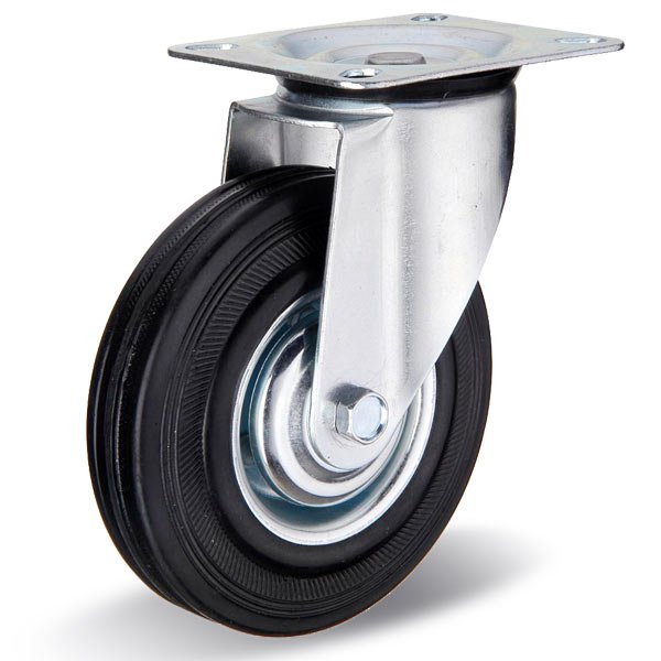 Колесные опоры серии С-SLS с платформенным креплением. Шинка — полуэластичная черная резина, обод из листовой стали с двух сторон закрыт защитными колпачками. В оси колеса роликовый подшипник. Поворотный узел с двухрядным шарикоподшипником. Стальной тормоз фиксирует поворот колеса и поворотный узел. Рабочая температура от -25°С до +50°С