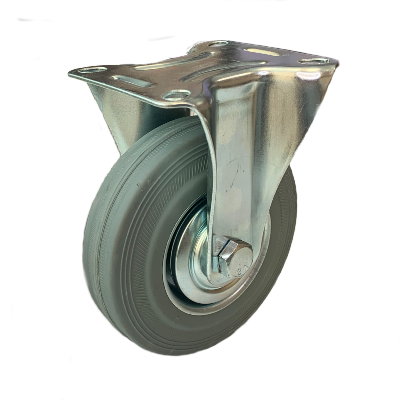 Колесные опоры серии С-SES с платформенным креплением. Шинка — полуэластичная СЕРАЯ РЕЗИНА, обод из листовой стали с двух сторон закрыт защитными колпачками. В оси колеса роликовый подшипник. Поворотный узел с двухрядным шарикоподшипником. Стальной тормоз фиксирует поворот колеса и поворотный узел. Рабочая температура от -25°С до +50°С