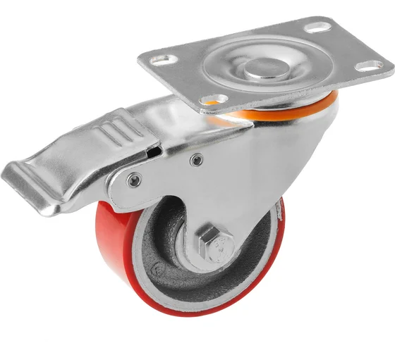 Большегрузные колеса серии DUS отлиты из чугуна и покрыты защитным слоем лака. Контактный слой — полиуретан бордового цвета твердостью 92 Shore A. В оси колеса шариковый подшипник.