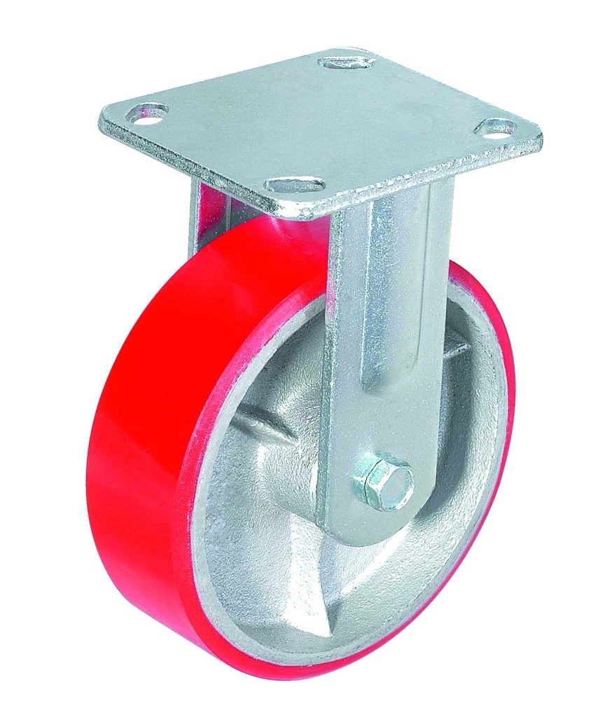 Большегрузные колеса серии DUS отлиты из чугуна и покрыты защитным слоем лака. Контактный слой — полиуретан бордового цвета твердостью 92 Shore A. В оси колеса роликовый подшипник.