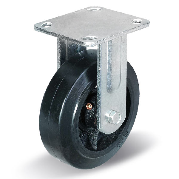 Большегрузные обрезиненные колесные опоры с платформенным креплением. Шинка изготовлена из черной резины, обод из чугуна, для смазки подшипника имеется ниппель. Стальной оцинкованный кронштейн, толщина стали 6 мм. В поворотном механизме двухрядный шариковый подшипник снабжен ниппелем для смазки.