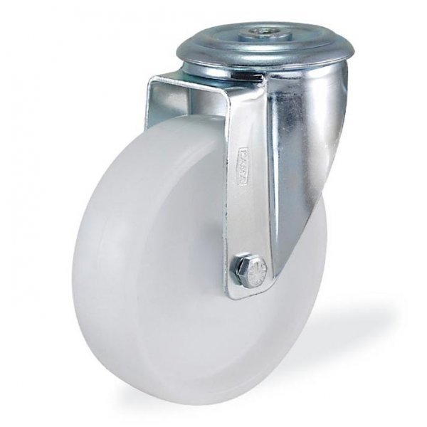 Поворотные колесные опоры, крепление — отверстие под один центральный болт. Колеса отлиты из полипропилена белого цвета. В оси
