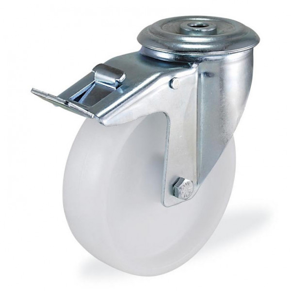 Поворотные колесные опоры, крепление — отверстие под один центральный болт. Колеса отлиты из полипропилена белого цвета. В оси