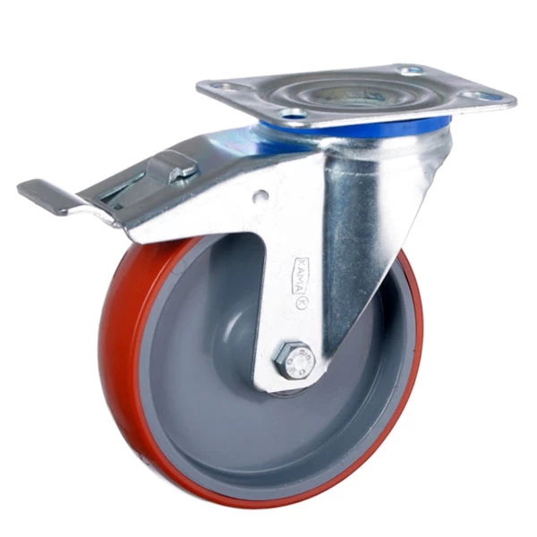 Колесо отлито из полиамида, контактный слой — полиуретан красного цвета, твердость 95˚±2 Shore A. Профиль шинки закругленный. Колеса бережно относятся к поверхности пола, не оставляют следов при этом очень устойчивы к истиранию и воздействию многих агрессивных веществ. В оси роликовый подшипник. В поворотном узле кронштейна двухрядный шарикоподшипник, крепление площадка под четыре болта. Рабочая температура от -20˚С до +70˚С. Производство завода «КАМА» (Турция).