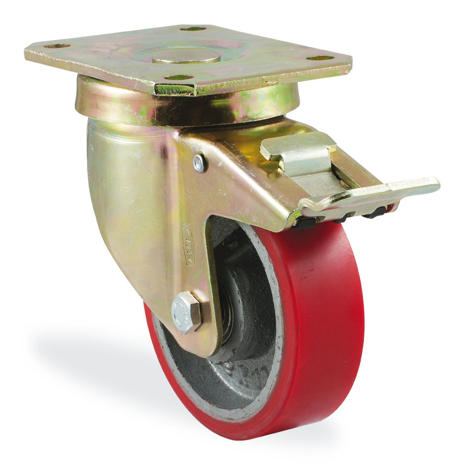 Обод колеса отлит из серого чугуна, контактный слой — полиуретан светло коричневого цвета. Колеса бережно относятся к поверхности пола и не оставляют следов.