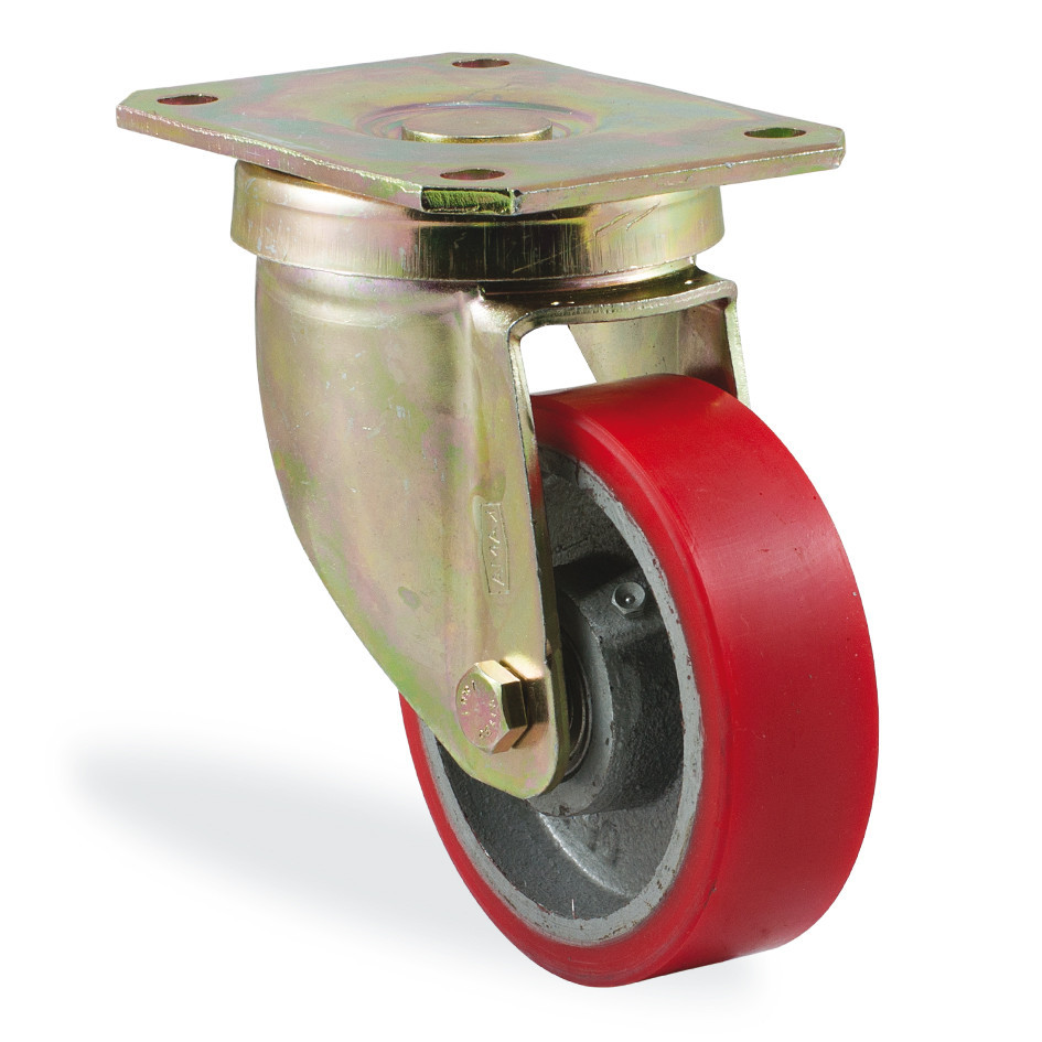 Обод колеса отлит из серого чугуна, контактный слой — полиуретан светло коричневого цвета. Колеса бережно относятся к поверхности пола и не оставляют следов.