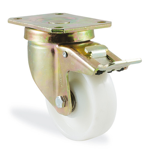 Колеса из полиамида белого цвета. Не оставляют следов на полу, устойчивы к коррозии и воздействию многих агрессивных веществ и не поглощает влаги. В оси колеса два прецизионных шарикоподшипника.