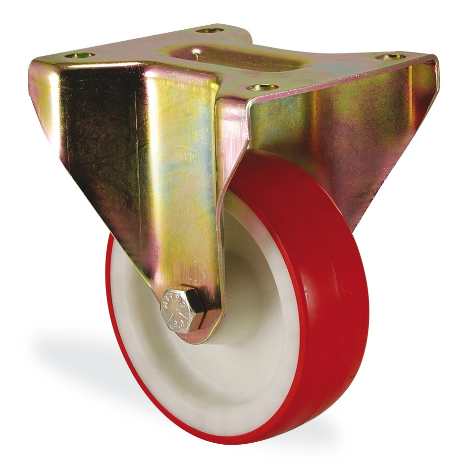 Обод колеса изготовлен из высококачественного полиамида белого цвета, контактный слой из полиуретана красного цвета твердостью 96˚ Shore A. В оси колеса подшипник скольжения.