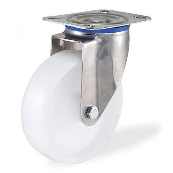 Поворотные колесные опоры из нержавеющей стали марки AISI 304, крепление площадка под 4 болта. Все детали (шарики, осевая втулка, болт и гайка) также изготовлены из нержавеющей стали, устойчивы к коррозии и влиянию кислот. Колеса отлиты из высококачественного полипропилена белого цвета. В оси втулка скольжения.
