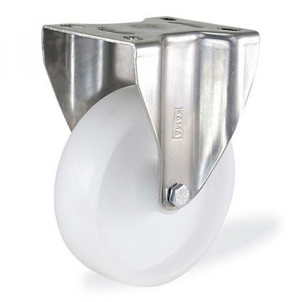 Поворотные колесные опоры из нержавеющей стали марки AISI 304, крепление площадка под 4 болта. Все детали (шарики, осевая втулка, болт и гайка) также изготовлены из нержавеющей стали, устойчивы к коррозии и влиянию кислот. Колеса отлиты из высококачественного полипропилена белого цвета. В оси втулка скольжения.