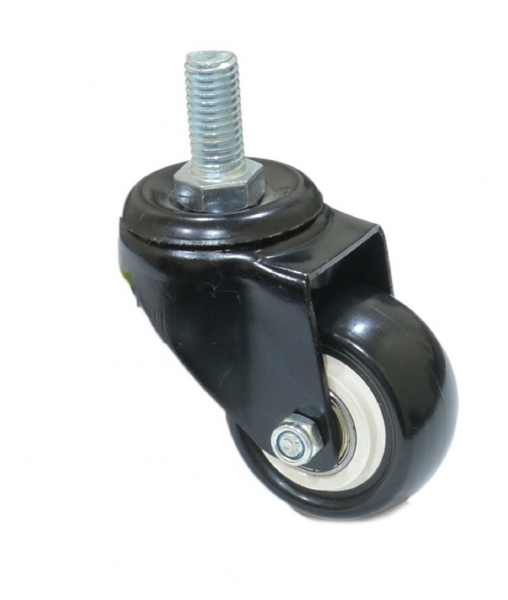 Поворотные колеса из черной резины с болтом предназначены для использования внутри помещений с чистыми ровными полами. Они применяются в гостиницах, медицинских учреждениях, заведениях торговли, общепите. Шина обеспечивает плавность хода и минимальный уровень шума во время движения. Кроме того, черная резина не оставляет следов на напольном покрытии, устойчива к слабым растворам солей и кислот.
