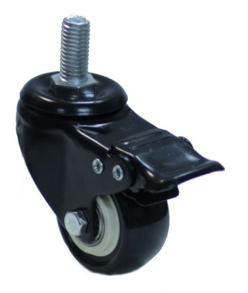Поворотные колеса из черной резины с болтом предназначены для использования внутри помещений с чистыми ровными полами. Они применяются в гостиницах, медицинских учреждениях, заведениях торговли, общепите. Шина обеспечивает плавность хода и минимальный уровень шума во время движения. Кроме того, черная резина не оставляет следов на напольном покрытии, устойчива к слабым растворам солей и кислот.