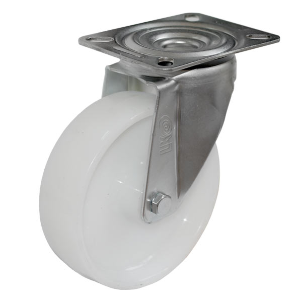 Поворотные колесные опоры, крепление — площадка под четыре болта. Колеса отлиты из полипропилена белого цвета. В оси колеса втулка