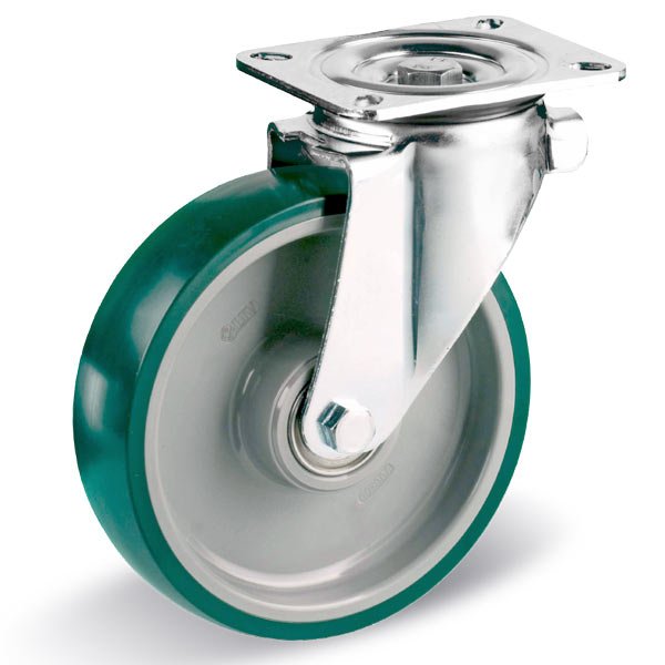 Большегрузные колеса серии LK-PUR обод изготовлен из полиамида серого цвета, шинка зеленый полиуретан твердостью 95˚ Shore А. В оси