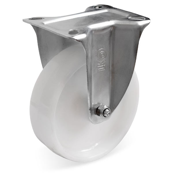 Поворотные колесные опоры, крепление — площадка под четыре болта. Колеса отлиты из полипропилена белого цвета. В оси колеса втулка