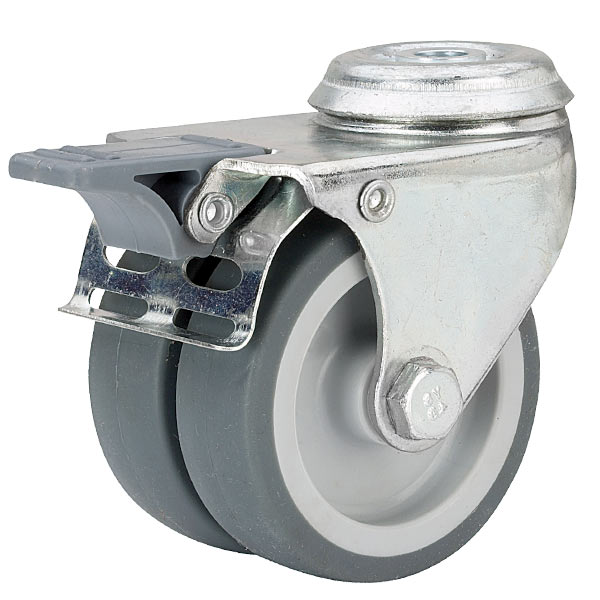 Сдвоенные колесные опоры очень маленького диаметра. Поворотный кронштейн из листовой стали с креплением под один центральный болт.Обод колеса отлит из высококачественного полипропилена, шинка — термопластичная светло серая резина. В оси втулка скольжения. Рабочая температура от -20°С до +60°С. Производство завода «ALEX» (Испания).